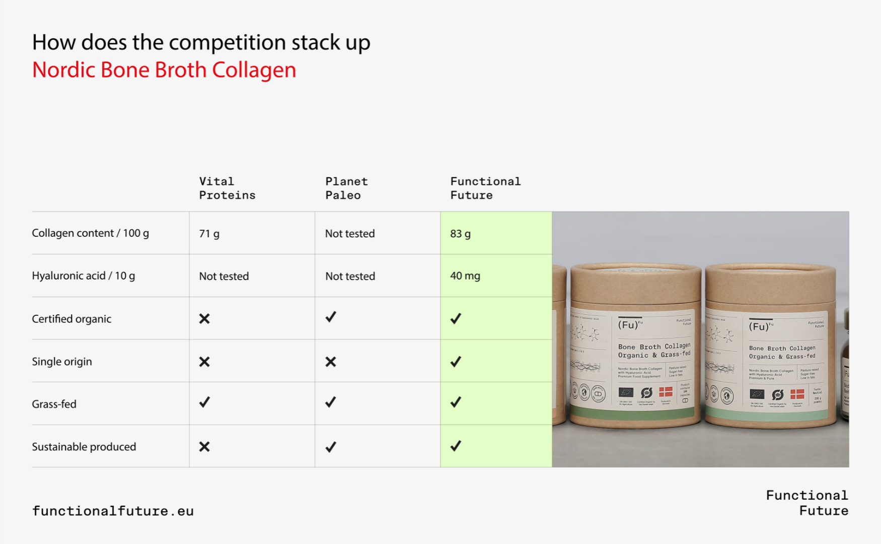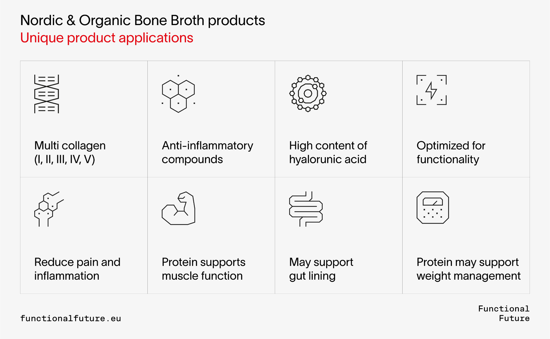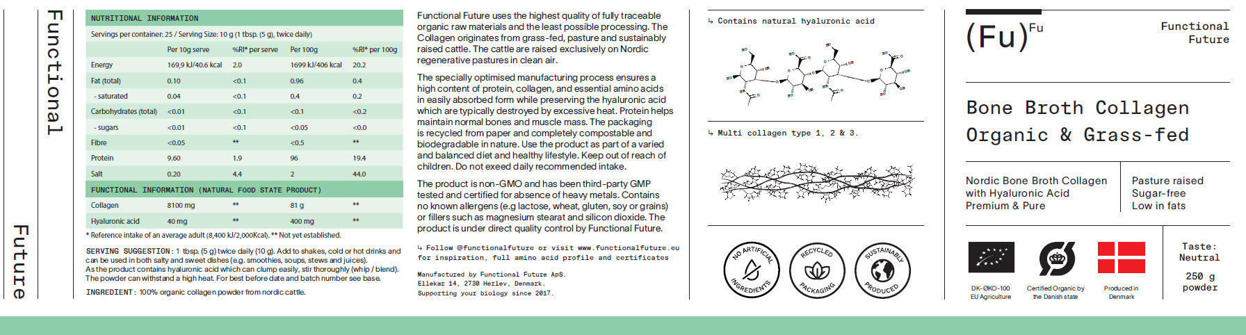 Our organic bone broth collagen powder is carefully crafted from collagen and hyaluronic acid derived from grass-fed Nordic cattle. Developed in collaboration with Danish farmers and technology experts, the product reflects our deep commitment to purity, sustainability, and transparency.